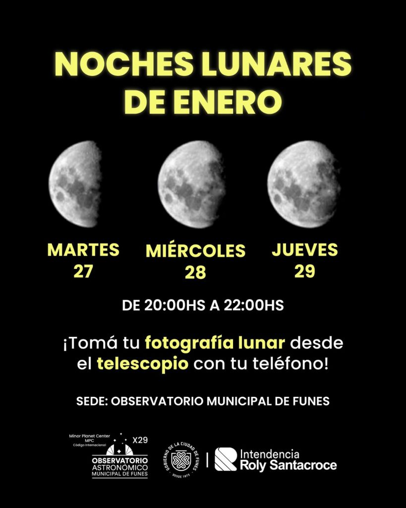El Observatorio Astronómico Municipal de Funes invita a la comunidad a participar de una nueva propuesta abierta y gratuita denominada “Noches lunares”, una actividad de observación de la Luna con telescopios que se desarrollará durante tres jornadas consecutivas, de 20 a 22 horas, en el predio de la estación del ferrocarril, donde funciona la sede del observatorio.
